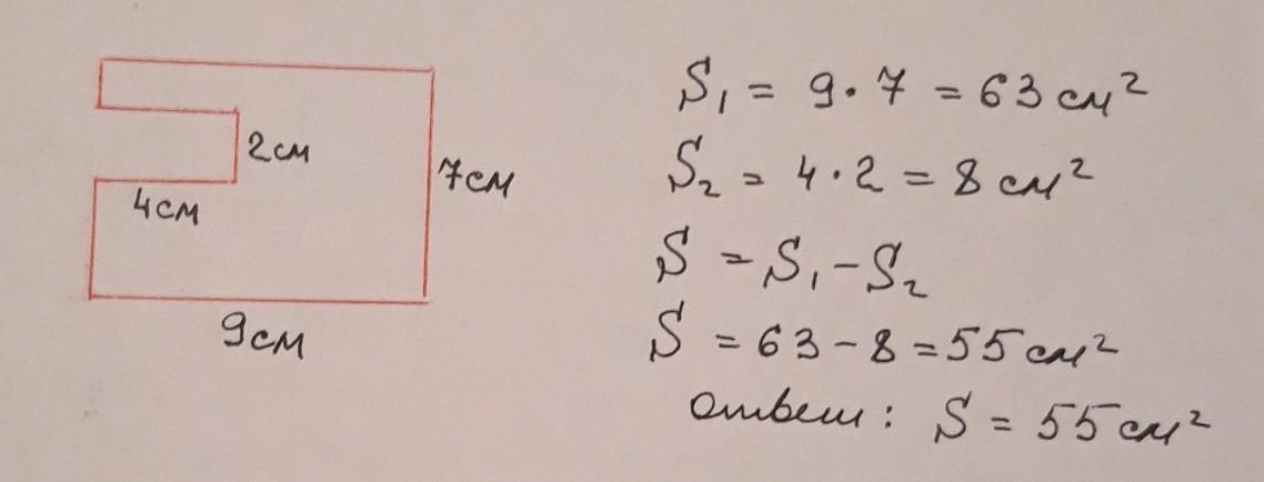 7×9-4×2=55 по-моему так. перечитай. находишь площадь большого и вы читаешь площадь маленьпого
