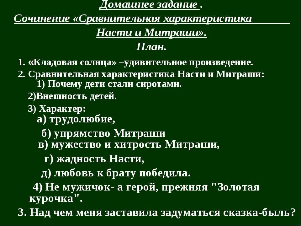 Произведение кладовая солнца-удивительное произведение. Оно начитается с повествования о двух детях которые стали сиротами. Их отец погиб на Отечественной войне, а мама умерла от болезни. Настя и Митраша были похожи внешностью. Настю за ее веснушки называли «Золотой Курочкой», а брата из-за его взбитого тела – «Мужичком в мешочке». Сначала детям помогали соседи и дальние родственники, а потом дети научились всему сами. Двенадцатилетняя Настя рано вставала и хлопотала по хозяйству. Митраша, которому было чуть больше десяти лет, умел делать деревянную посуду, иногда выручал за нее кое-что, участвовал в общественных собраниях и работах. Митраша был мальчиком довольно упрямым. Если он был в чем-то убежден, то переспорить его было невозможно. Настя во всем берет пример с покойной матери: она вспоминает, как мама ходила за грибами и обвязывает через плечо полотенце, чтобы большой вес клюквы не резал ей плечо. Когда дети пошли за клюквой Митраша решил свернуть по тропинке. Настя же пошла длинным путем. Когда настя дошла до палестинки жадность охватила ее. Она собирала и не могла остановиться. Пытаясь поделиться с собакой хлебом, Настя наконец вспомнила о Митраше. Девочка громко позвала брата, но, не услышав унесенный ветром ответ, присела возле корзины и заплакала. Вспомнив о зайце, Травка побежала за ним дальше. Голодный Митраша тут же сообразил, «что все спасение его будет в этом зайце». Мальчик притаился в кустах можжевельника. Сюда же Травка погнала зайца, и прибежал на лай собаки Серый. Увидев волка в пяти шагах от себя, Митраша выстрелил в него и убил.
