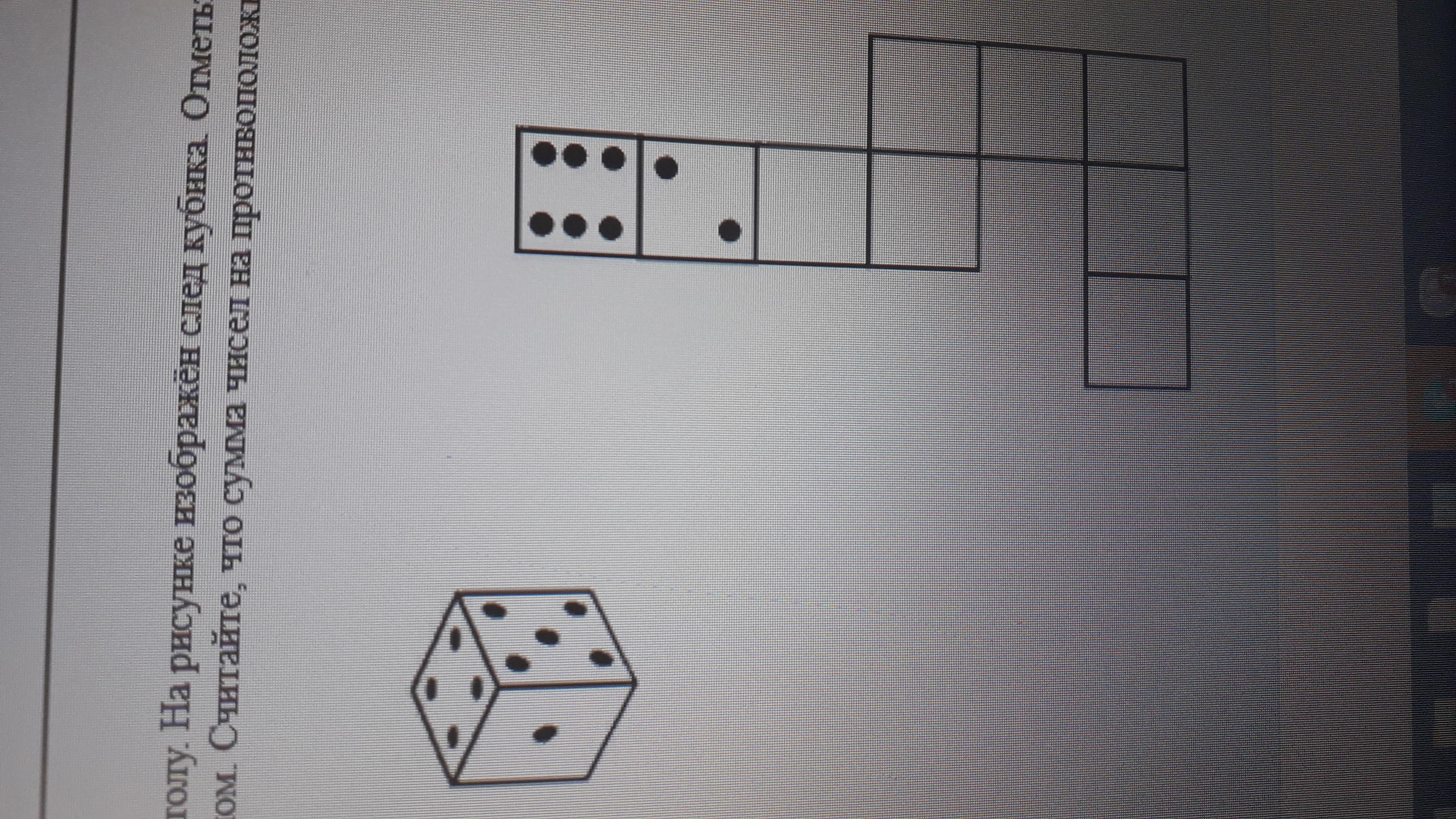 85 балов!!! Срочно!!!! Игральный кубик прокатили по столу. На рисунке изображён след кубика. Отметьте на рисунке место, в котором грань с тремя точками соприкасались со столом. Считайте, что сумма чисел на противоположных сторонах кубика равна 7. Помогите пожалуйста