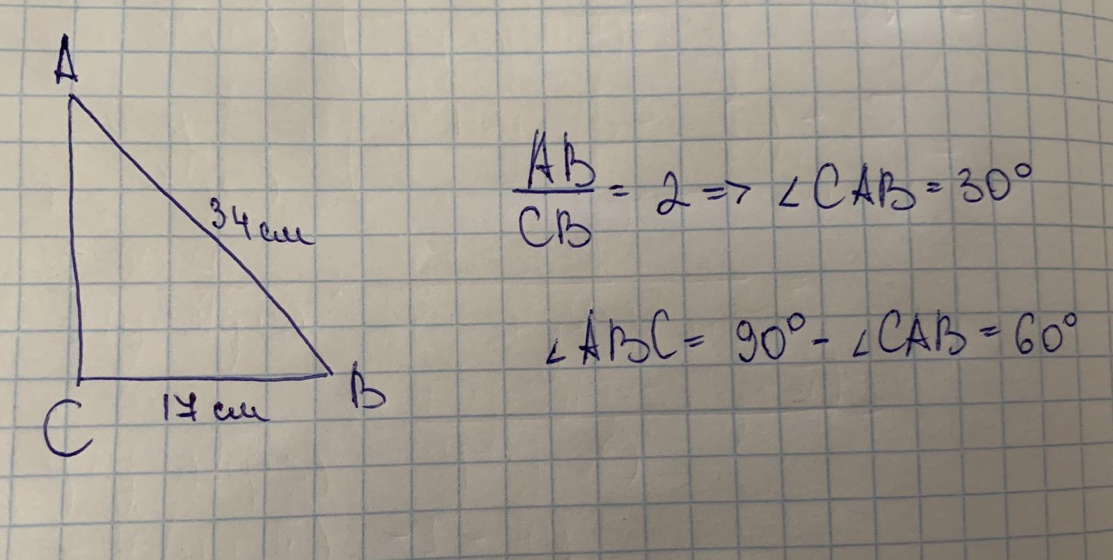один з катетів прямокутного трикутника дорівнює 17 см а гіпотенуза 34 см знайдіть гострі кути трикутника