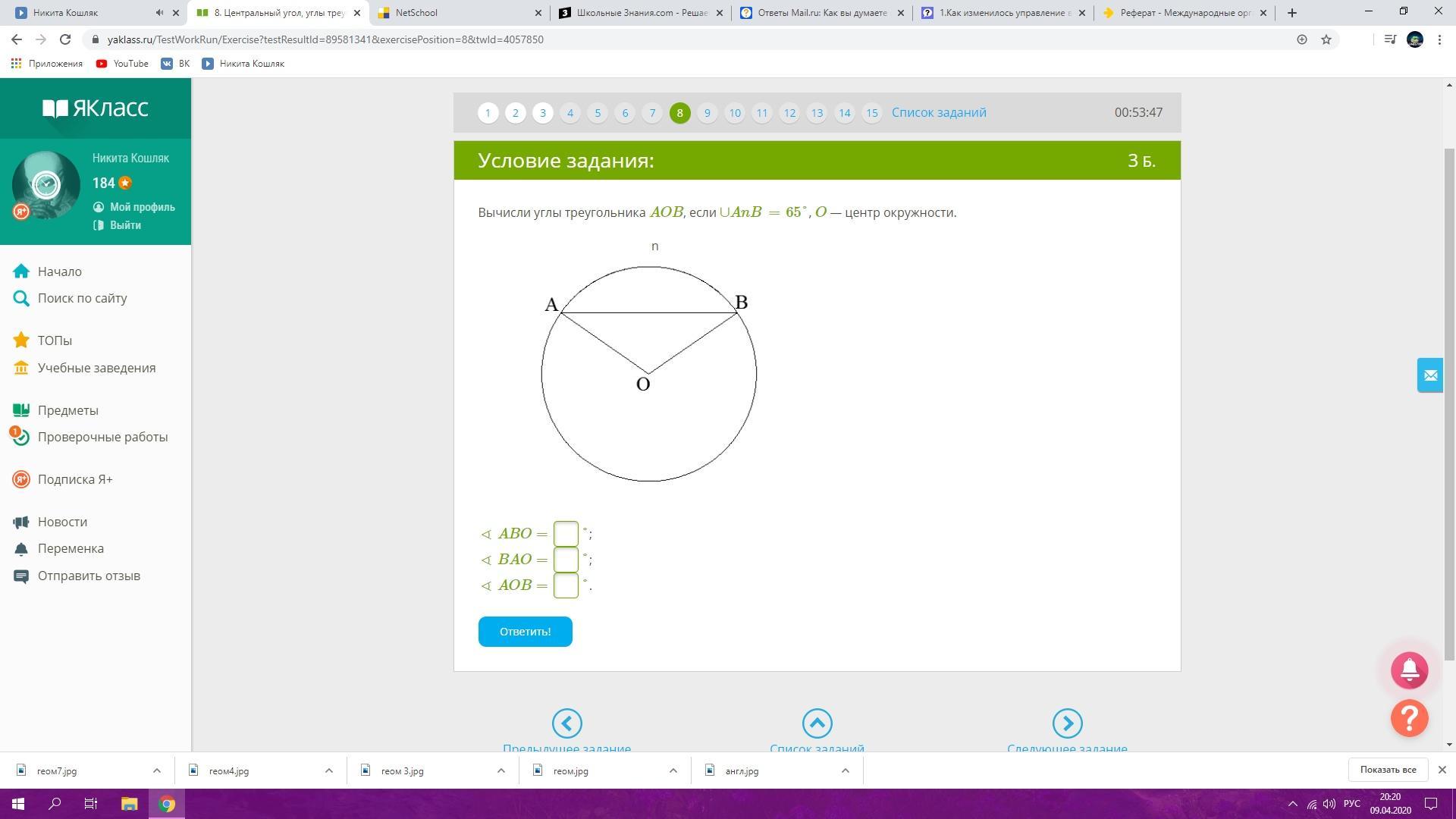 Вычисли углы треугольника AOB, если ∪AnB= 65°, O — центр окружности.