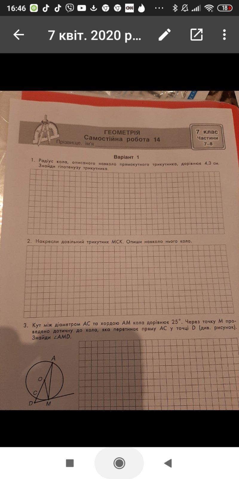Только третье задание пожалуйста!! Даю 25 баллов!!!! Перевод задания: угол между диаметром АС и хордой АМ круга равен 25°. Через точку М проведено касательную к окружности, которая пересекает прямую АС в точке D. Найди угол АМD
