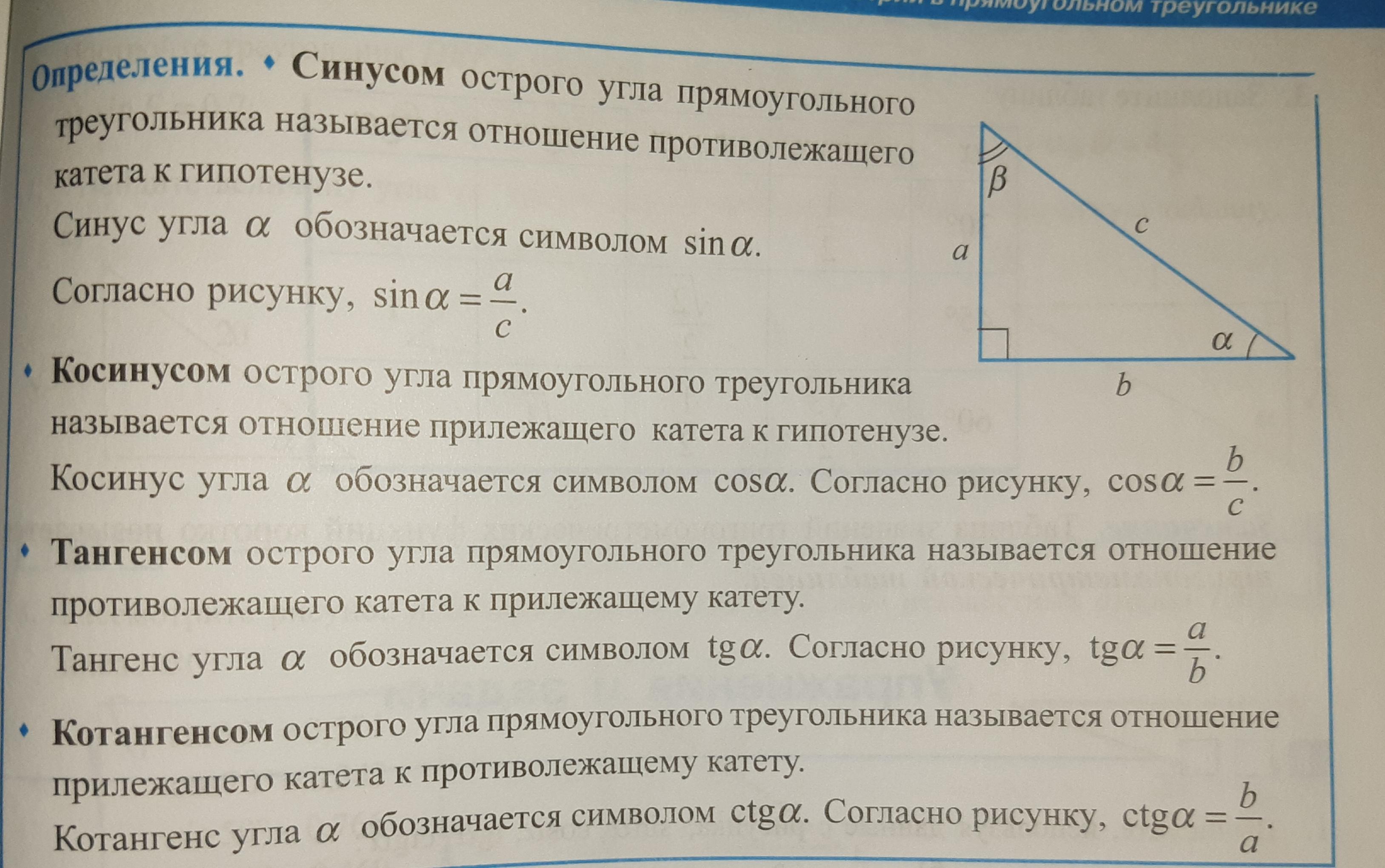 Запишите отношения, определяющие синус, косинус, тангенс и котангенс острого ушла B(бетта) треугольника, изображенного в определениях.