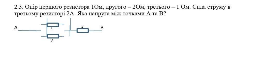 опір першого резистора 1 Ом,опір другого 2 Ом,третього -1 Ом.Сила струму в третьому резисторі 2 А.Яка напруга між точками А і В?