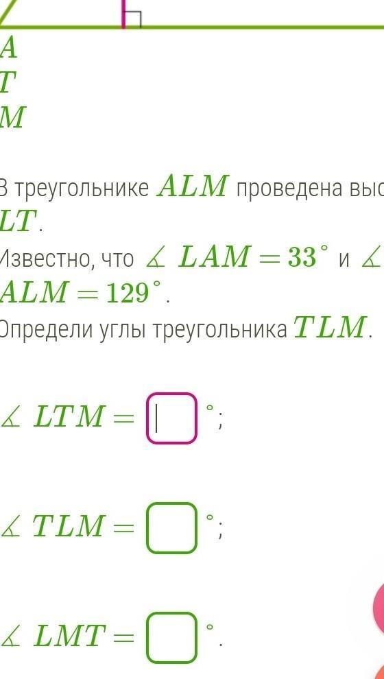 Известно, что LAM 33° и ALM = 129 Определи углы треугольника KLM.
