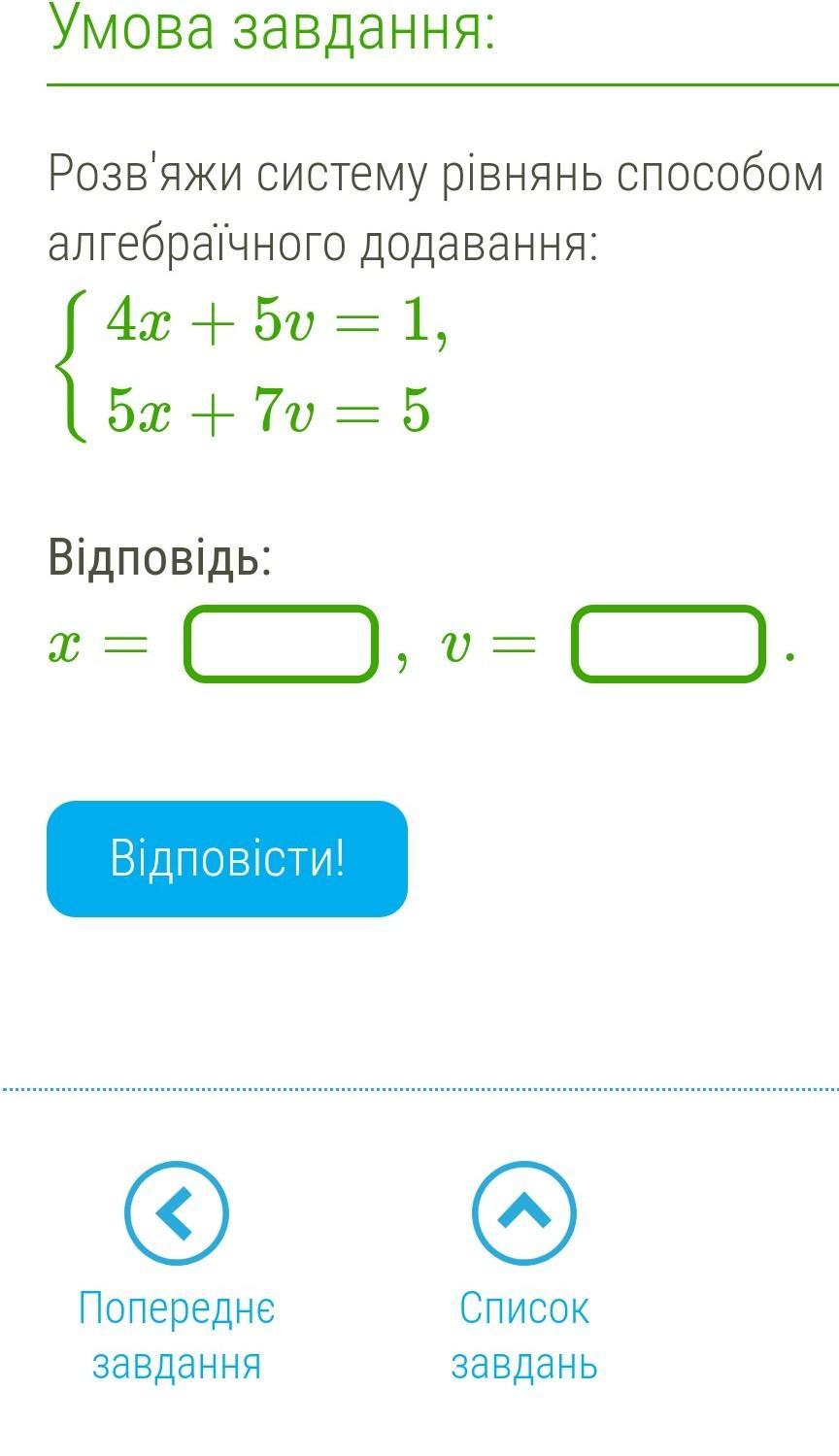 Розв'яжи систему рівнянь способом алгебраїчного додавання: {4x+5v=1,5x+7v=5
