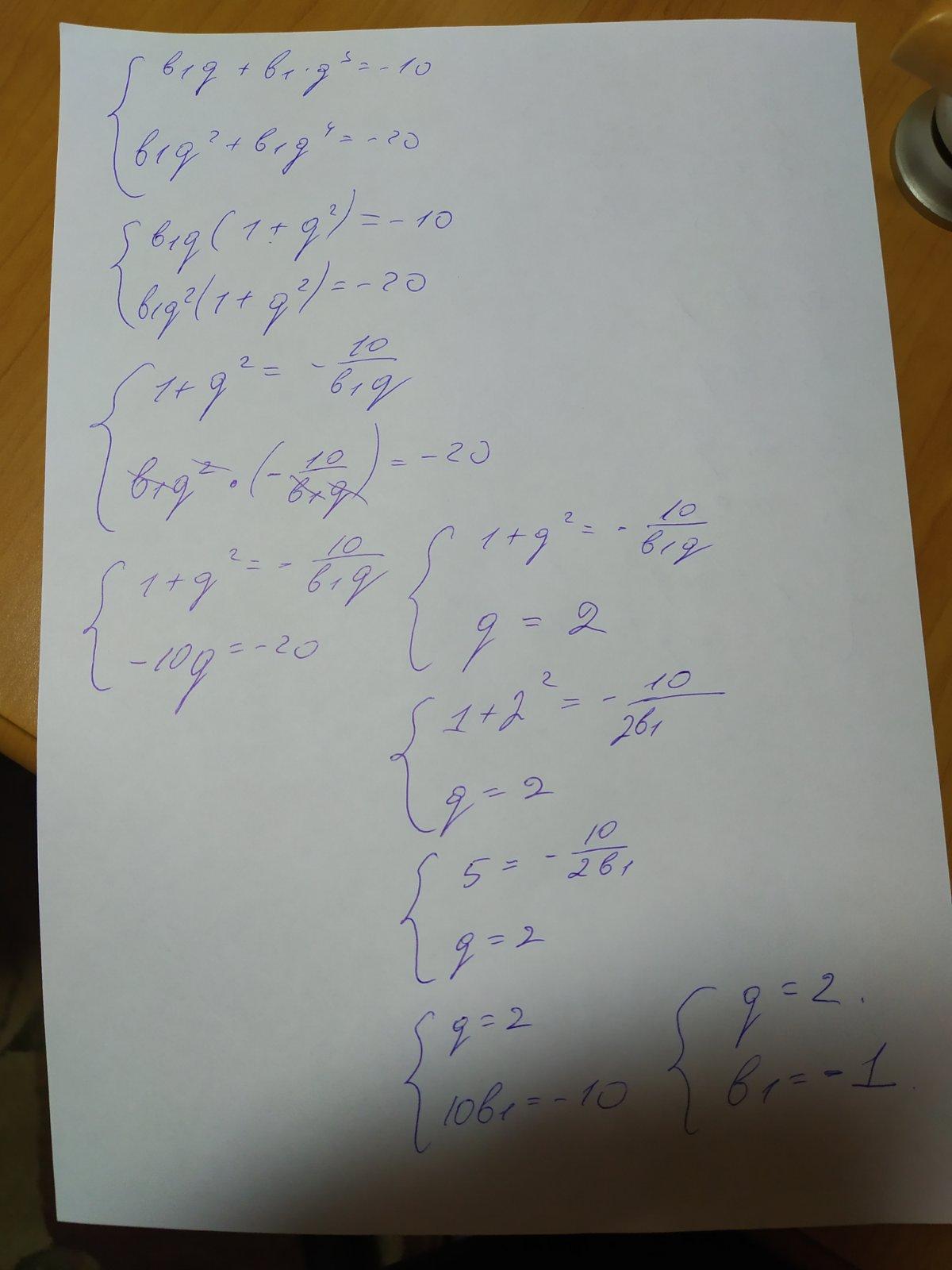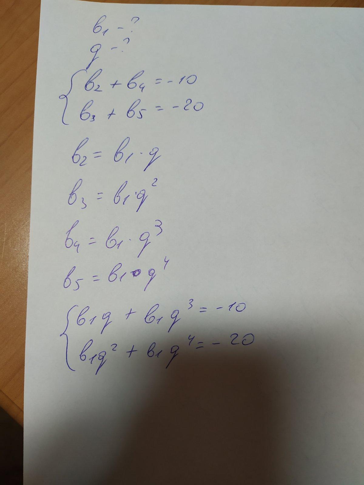 Знайдіть знаменник і перший член геометричної прогресії, якщо сума другого і четвертого її членів дорівнює -10, а сума третього і п’ятого членів цієї послідовності дорівнює -20