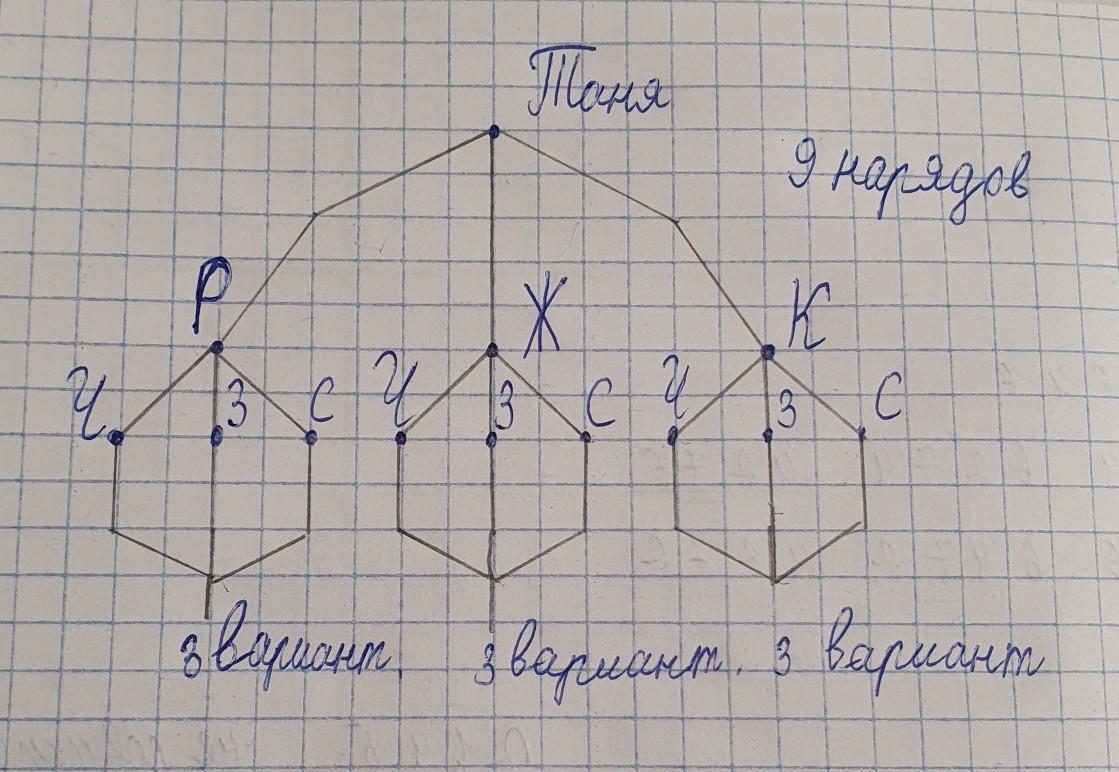 3. У Тани есть розовая, желтая, красная кофта и черная, зеленая, синяя юбки. Сколько различны нарядов можно составить из них?