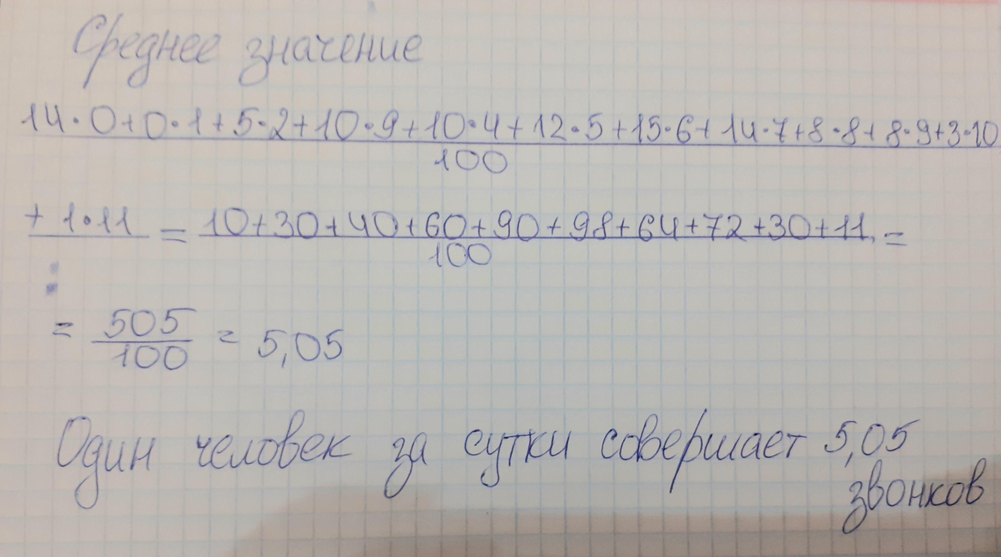 Объяснение: просто каждое количество звонков умножаем на его участников. Суммируем получившиеся числа и делим на всех участников(то есть 100).