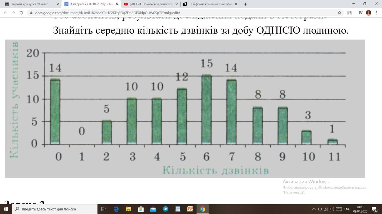 Телефонна компанія хоче дізнатися скільки в середньому людина робить телефонних дзвінків за добу. Для цього було досліджено 100 абонентів, результати дослідження подали в гістограмі. Знайдіть середню кількість дзвінків за добу ОДНІЄЮ людиною