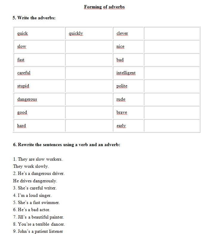 5.slowly, faster, carefully, stupidly, dangerously, better, harder, more clever, nicely, badly, intelligently, politely, rudly, bravely, earlier