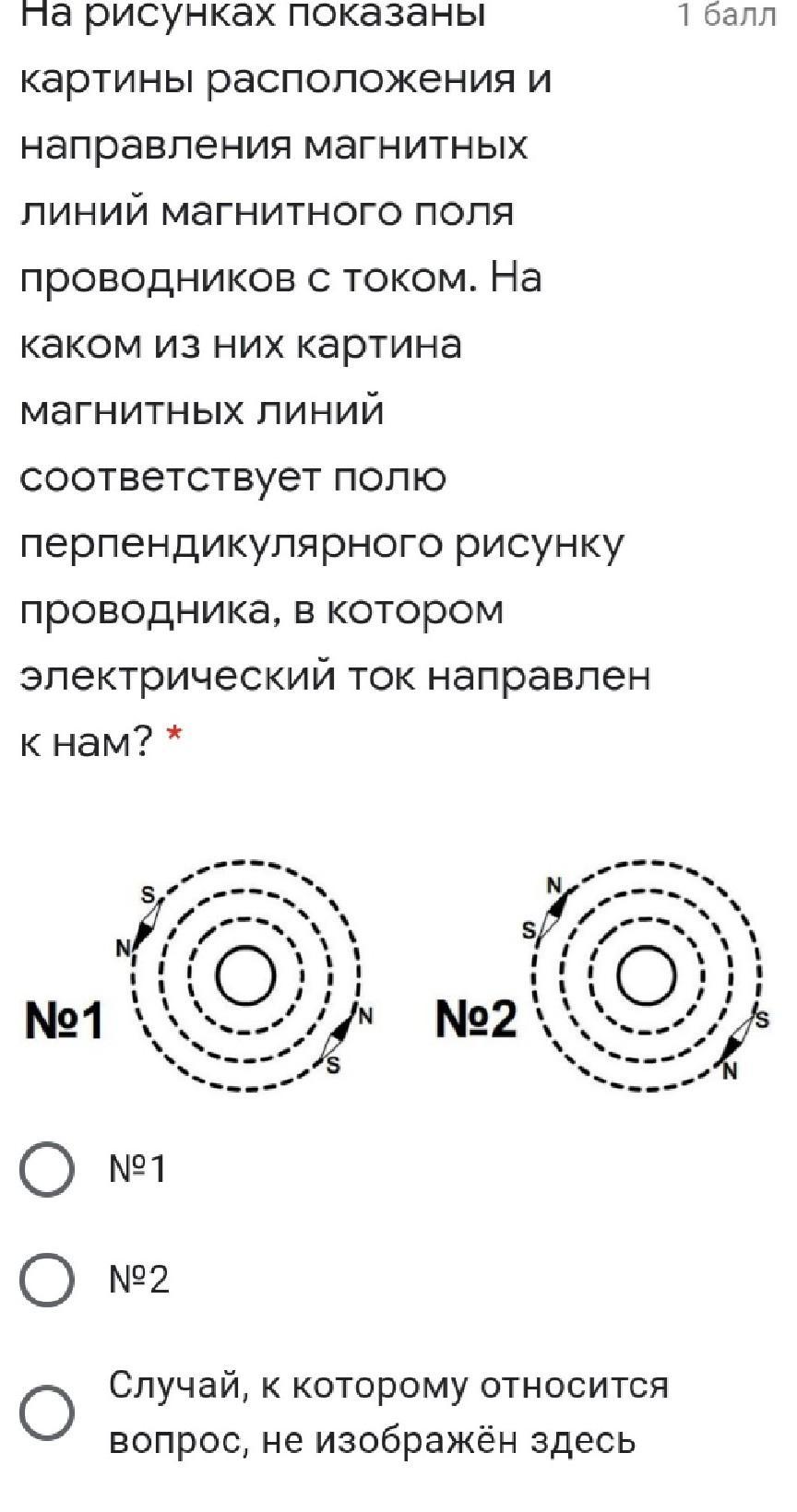 На рисунках показаны картины расположения и направления магнитных линий магнитного поля проводников с током. На каком из них картина магнитных линий соответствует полю перпендикулярного рисунку проводника, в котором электрический ток направлен к нам?