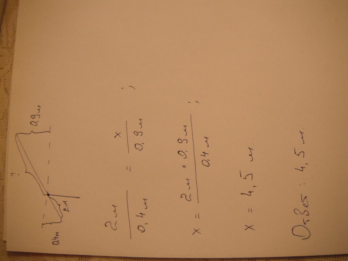 короткое плечо колодца с "журавлем" имеет длину 2м. когда конец короткого плеча поднялся на 0,4м конец длиного опустился на 0,9м.какова длина длинного плеча колодца