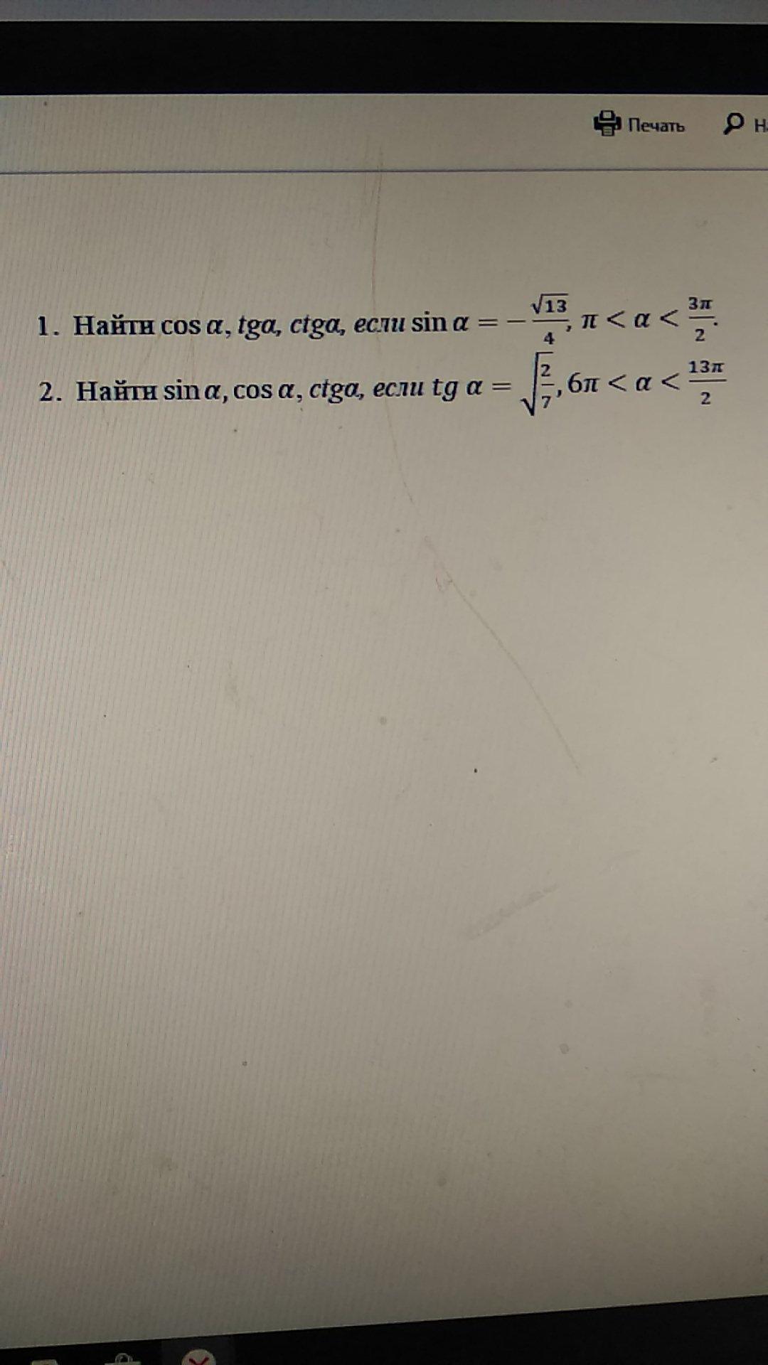 Найти cos, tgα, ctgα, если sin=−√13/4, π<α<3π/2