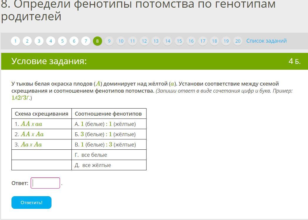 7) При скрещивании мух дрозофил, имеющих серое тело, получено потомство из 100 особей. Среди них мух с серым телом было 75, а остальные имели тёмное тело. Определи генотипы потомства. а)потомство с серым телом(рецессивные гомозиготы и гетерозиготы/гетерозиготы и гомозиготы по доминантному признаку/доминантные гомозиготы/гетерозиготы).б) потомство с тёмным телом(гетерозиготы/доминантные гомозиготы и гетерозиготы/доминантные гомозиготы/рецессивные гомозиготы)