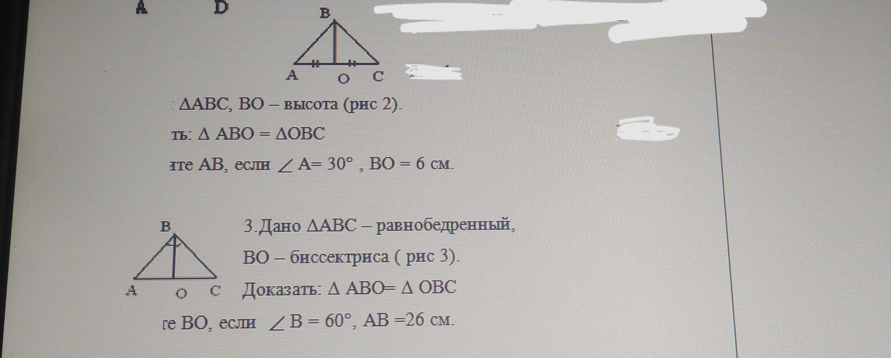 1) в равнобедренном треугольнике высота, опущенная из вершины к основанию является высотой, медианой и биссектрисой. Если угол В=60°, то, разделив его биссектрисой, угол АВО = углу ОВС = 30°.
