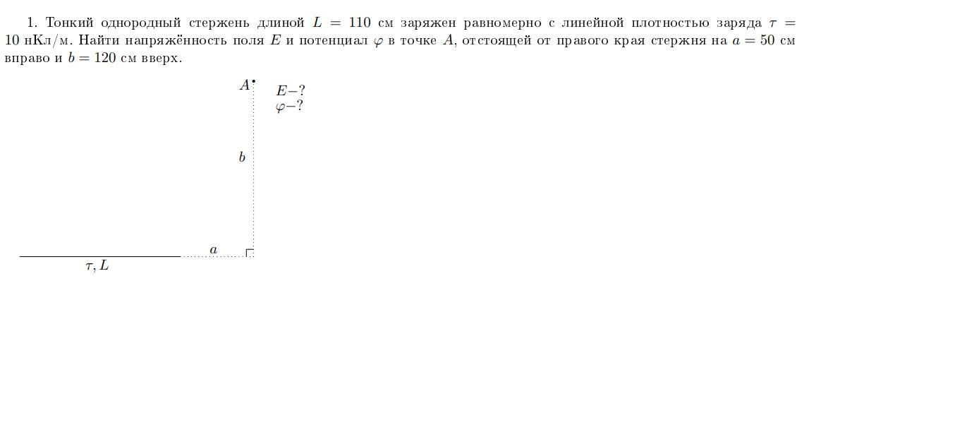 Тонкий однородный стержень длиной L = 110 см заряжен равномерно с линейной плотностью заряда 10 нКл/м. Найти напряженность поля E и потенциал в точке А, отстоящей от правого края стержня на a = 50 см вправо и b = 120 см вверх