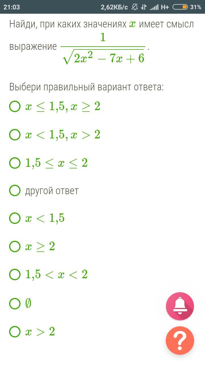 Найди, при каких значениях x имеет смысл выражение 12x2−7x+6−−−−−−−−−−√ .