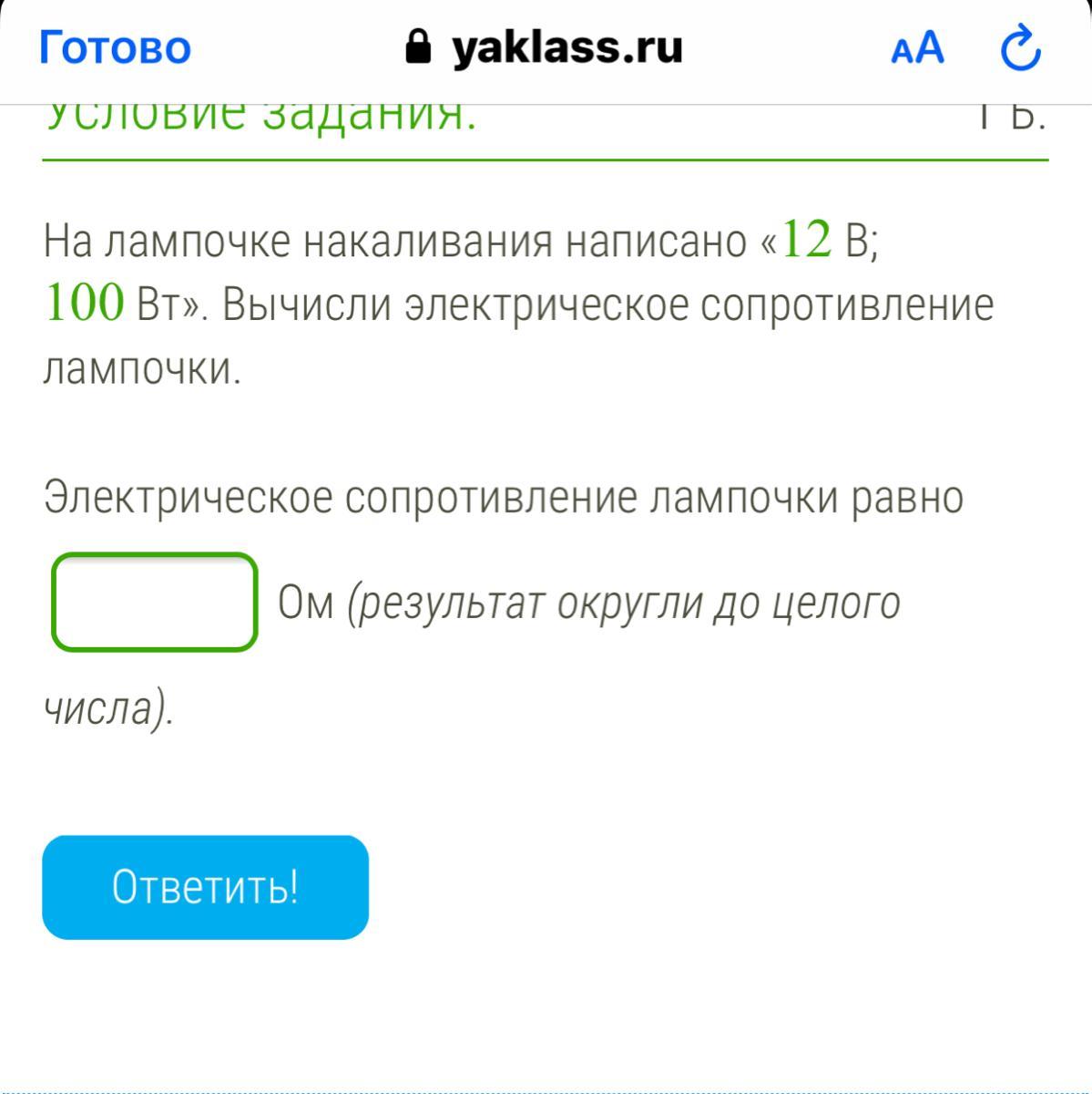 На лампочке накаливания написано «12 В; 100 Вт». Вычисли электрическое сопротивление лампочки.