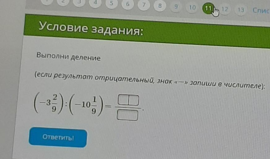 (-3 2^9)÷(-10 1^9 ) = 3 2^9 ÷10 1^9 = 2 + 3·9/9 ÷ 1 + 10·9/9 = 29^9 ÷ 91^9 = 29^9 × 9^91 = 29·9/9·91 = 261 819 = 29 · 9/91 · 9 = 29/91 ≈ 0.31868131868131866