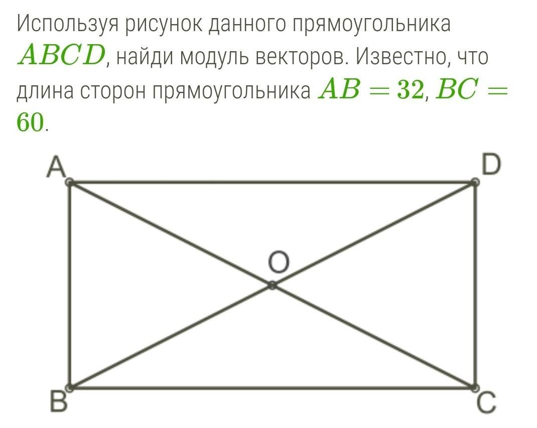 Используя рисунок данного прямоугольника ABCD, найди модуль векторов. Известно, что длина сторон прямоугольника AB= 32, BC= 60.