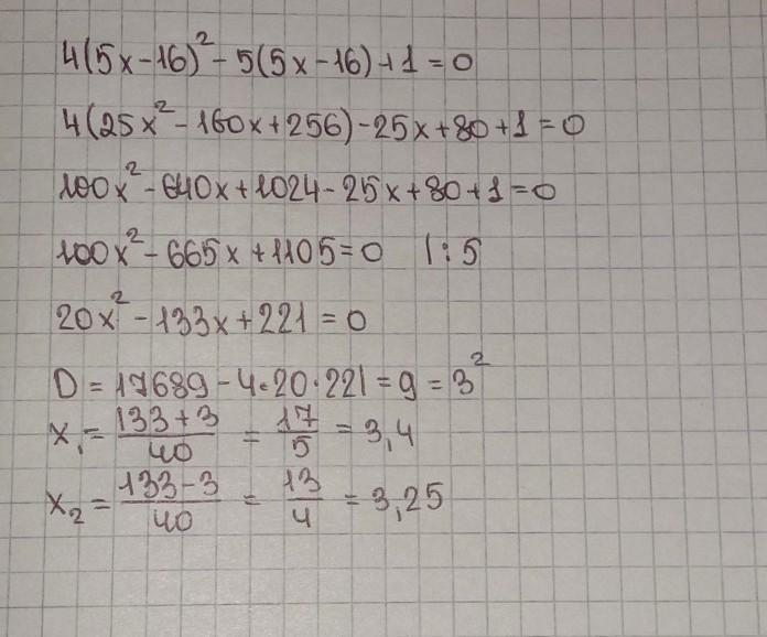 Реши квадратное уравнение 4(5x−16)2−5(5x−16)+1=0