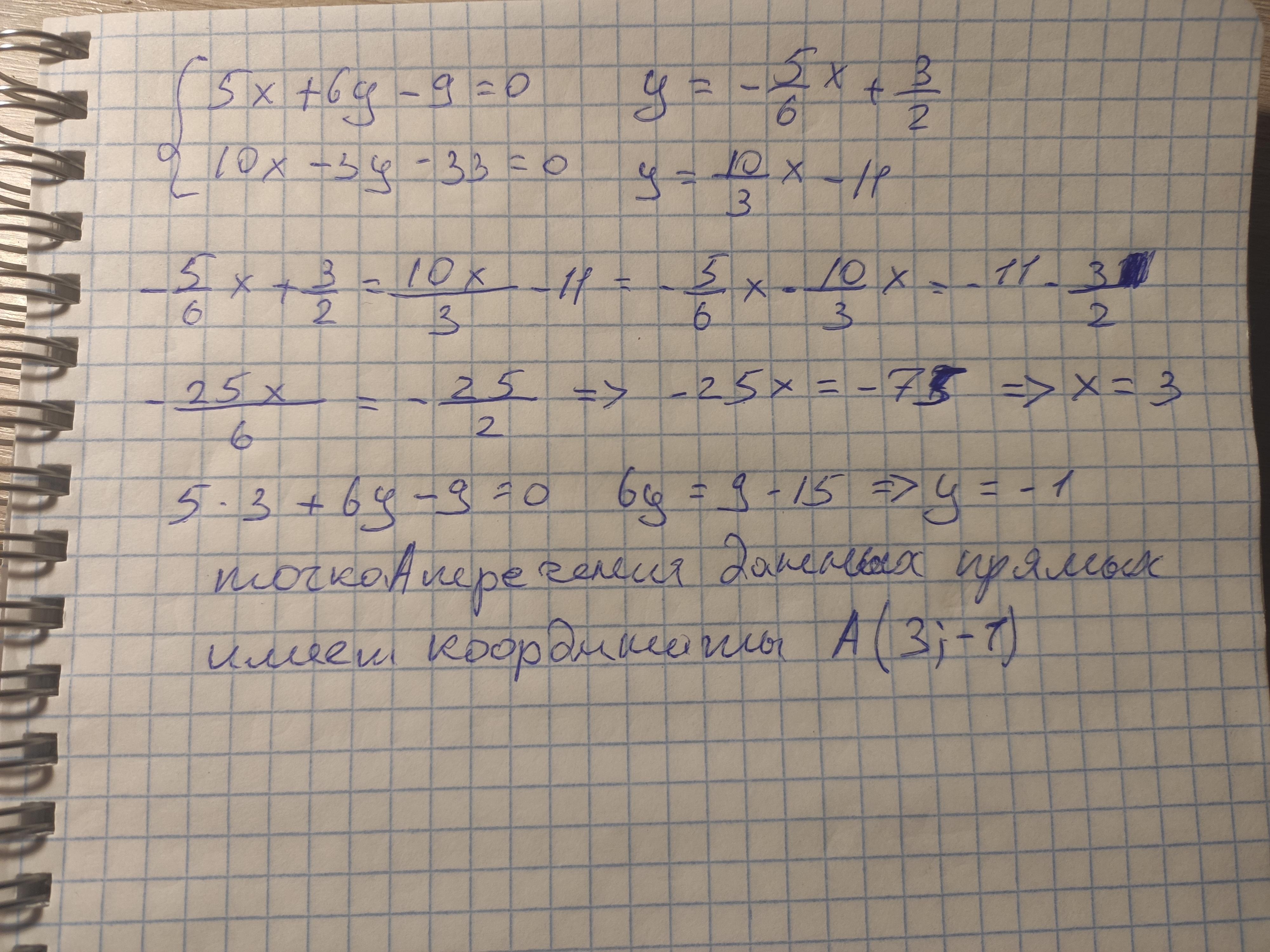 прямые 5x+6y−9=0 и 10x−3y−33=0 в точке A(3; −1)