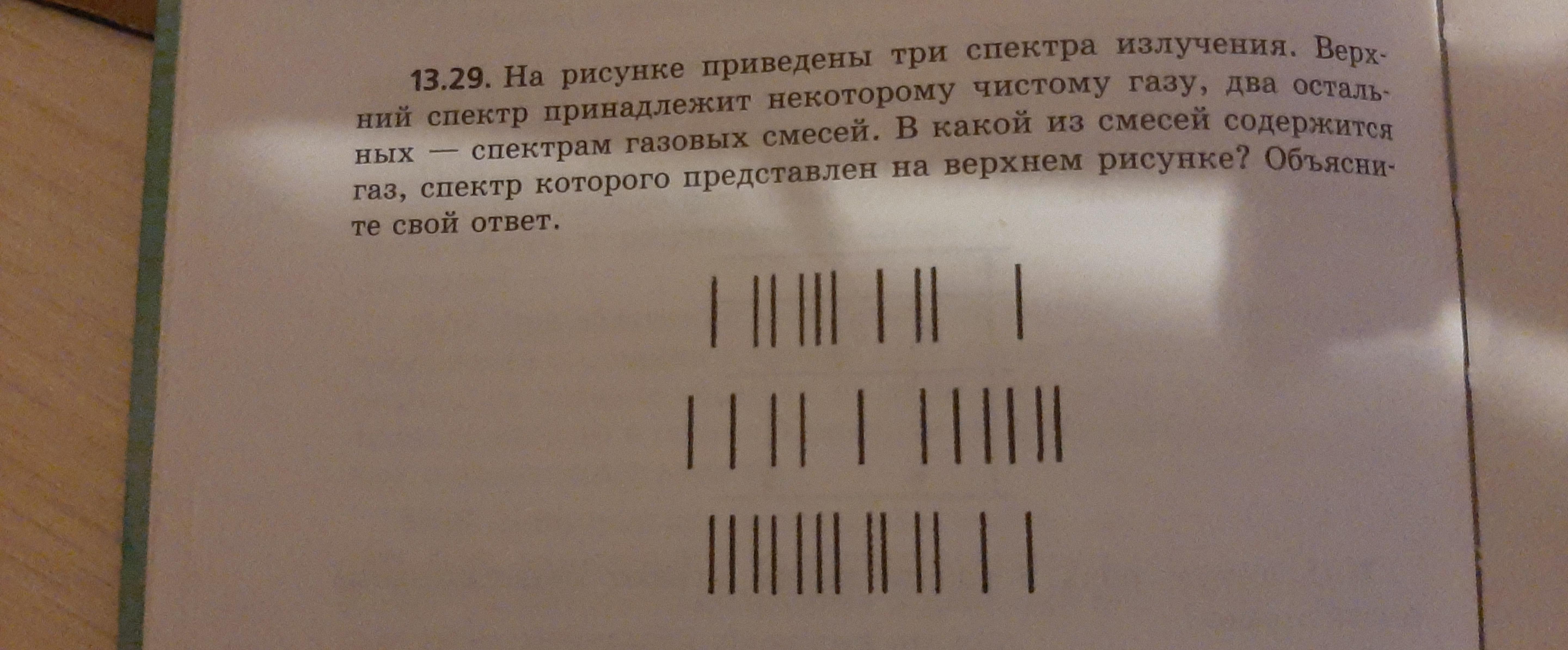 На рисунке приведены три спектра излучения. Верхний спектр принадлежит некоторому чистому газу, два остальных- спектрам газовых смесей. В какой из смесей содержится газ, спектр которого представлен на верхнем рисунке? Объясните свой ответ.