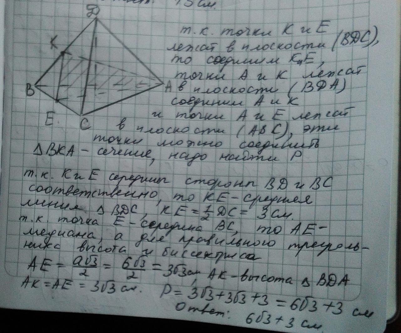 Точки К и Е - соответственно середины ребер DB и СВ тетраэдра DАВС. Постройте сечение тетраэдра плоскостью АКЕ и вычислите его периметр, если длина ребра тетраэдра равна 6 см.