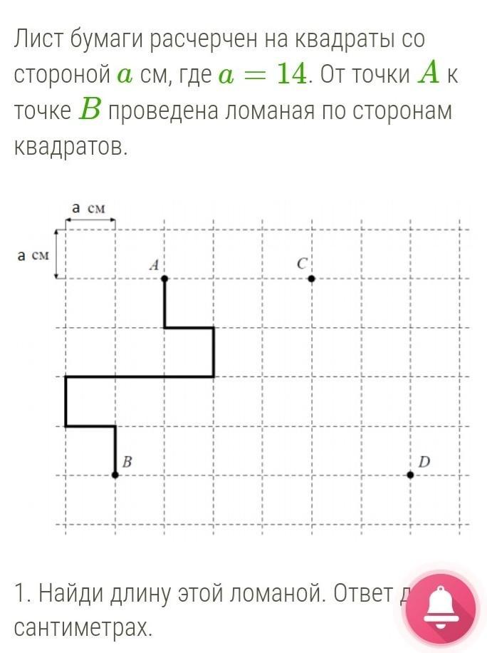 Лист бумаги расчерчен на квадраты со стороной a см, где a=14. От точки A к точке B проведена ломаная по сторонам квадратов.