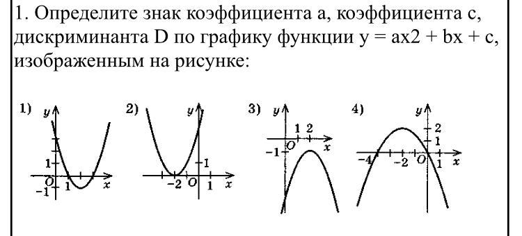 Определите знак коэффициента а, коэффициента с, дискриминанта D по графику функции у = ах2 + bх + с, изображенным на рисунке: