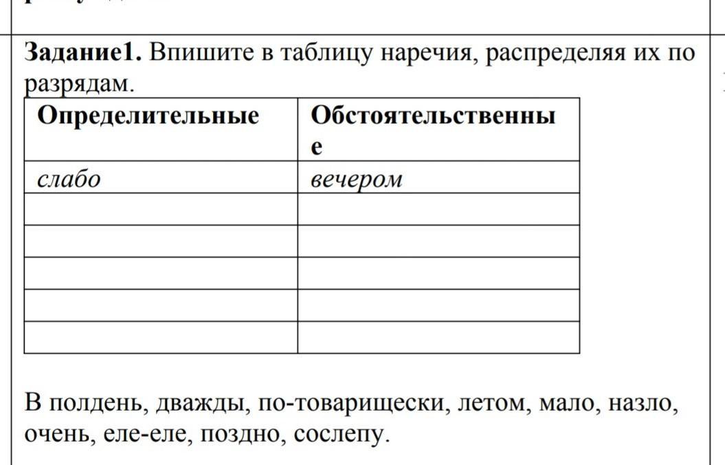 Ответ:1дважды,по-товарищески,мало,назло, очень,еле-еле,сослепу.