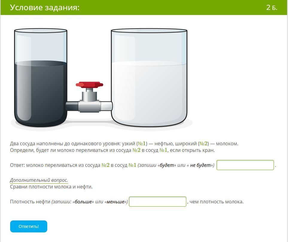 Ответ: молоко переливаться из сосуда №2 в сосуд №1 (запиши «будет» или « не будет»)