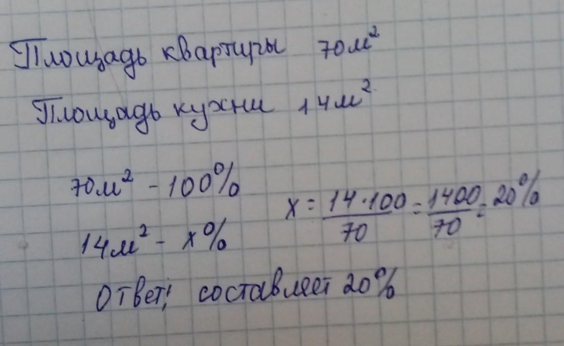 Площадь всей квартиры составляет 70м2 ,площадь кухни равна 14 м2 . сколько процентов составляет кухня от площади всей квартиры? помогите пожалуйста и напишите с обьяснением и со всеми действиями тк я понять хочу