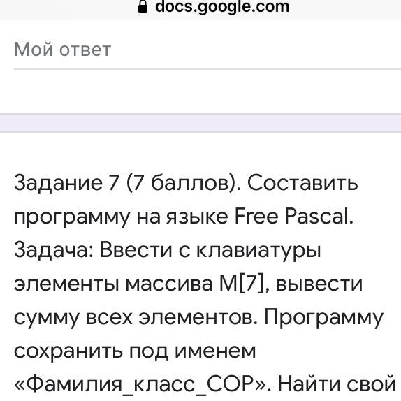 Составьте программу на языке Free Pascal. Задача: вести с клавиатуры элементы массива М[7], вывести сумму всех элементов.