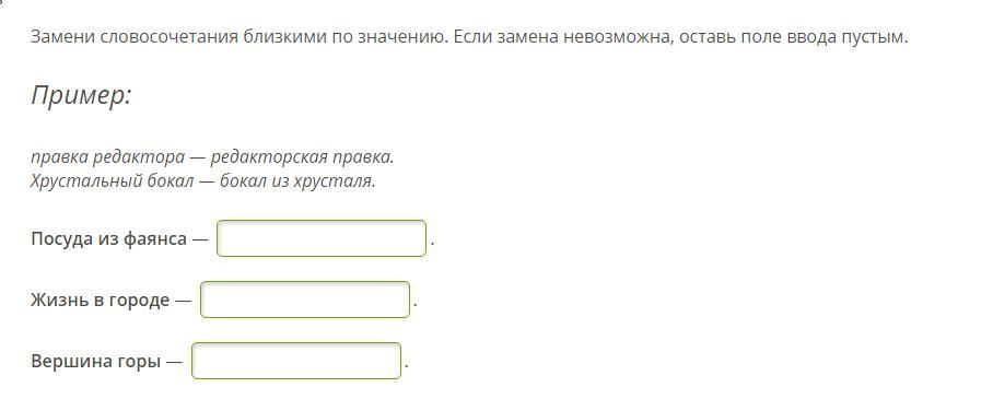 Замени словосочетания близкими по значению. Если замена невозможна, оставь поле ввода пустым.