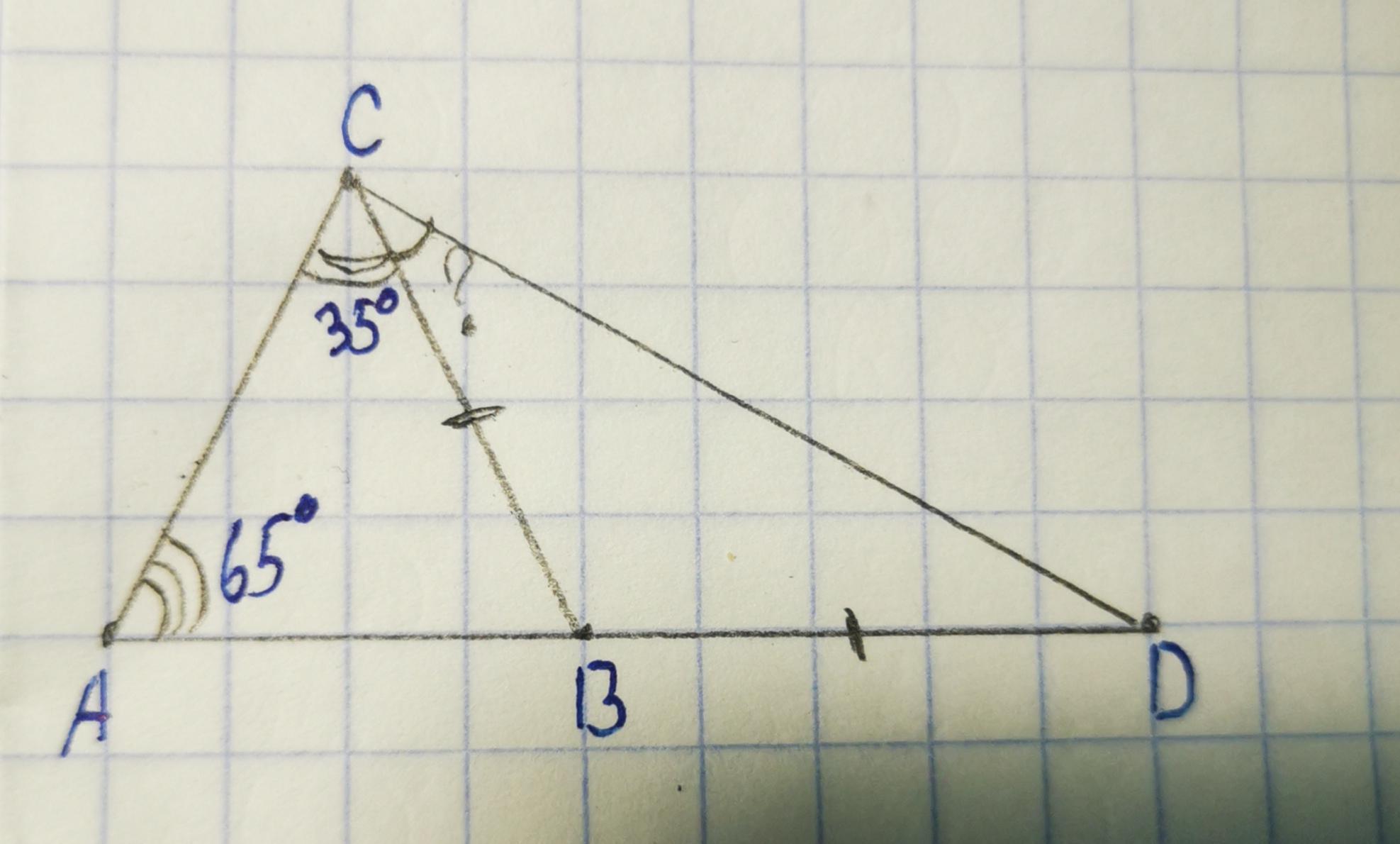 Сторона AB треугольника ABC проложена за точку B. На продолжении отмечена точка D так, что BC=BD. Найдите величину угла BCD, если угол ACB равен 35°, а угол BAC равен 65°. Ответ дайте в градусах. Запишите решение и ответ.