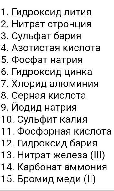 Напишите уравнения диссоциации для веществ: Гидроксид Лития,Нитрат Стронция,Сульфат Бария,Азотистая Кислота,Фосфат Натрия, Гидроксид Цинка,Хлорид Алюминия,Серная Кислота,Йодид Натрия,Сульфит Калия,Фосфорная Кислота, Гидроксид Бария,Нитрат железа (III),Карбонат Аммония,Бромид Меди (I)