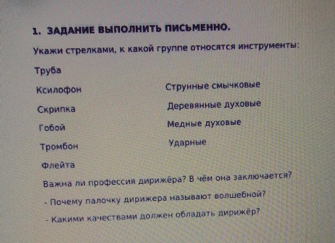 Труба-медные духовые,Ксилофон-ударные, скрипка-струнные смычковые,гобой- деревянные духовые,Тромбом- медные духовые, флейта- деревянные духовые