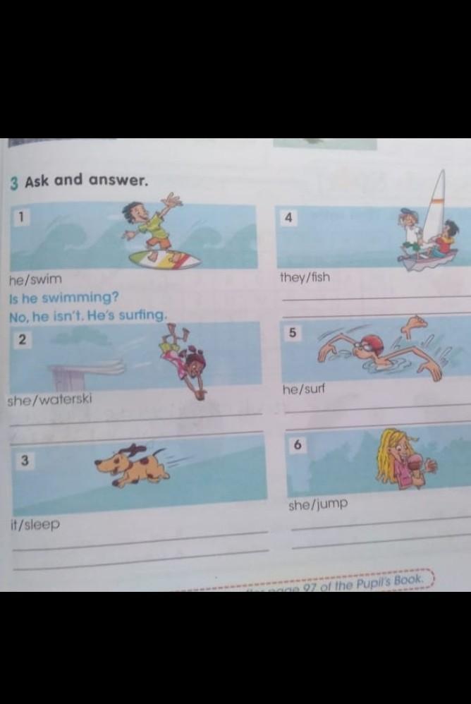 5. Is he surfing? No, he isn't. He is swimming.