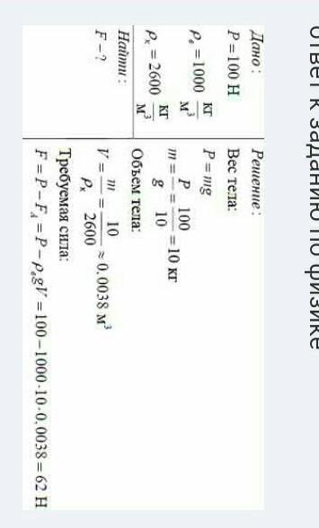 Какую силу надо приложить, чтобы удержать в воде камень, вес которого в воздухе 100 Н? Плотность камня 2500 кг/м3