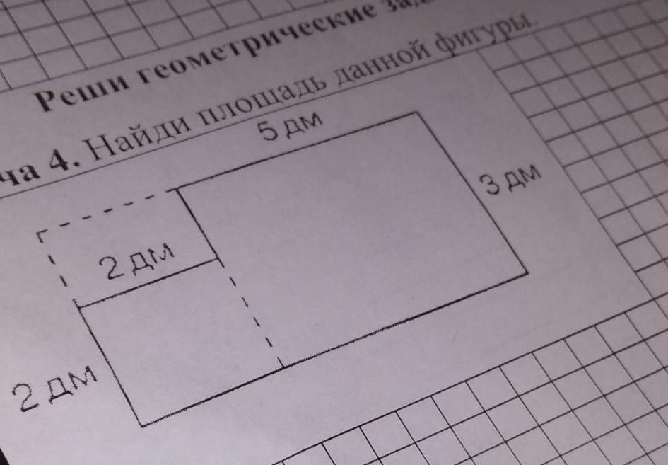 Данную фигуру можно разбить на две фигуры: слева квадрат (со стороной 2 дм) и справа прямоугольник (со сторонами 3 дм и 5 дм).