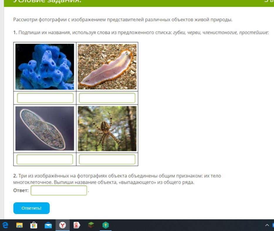 1. Подпиши их названия, используя слова из предложенного списка: губки, черви, членистоногие, простейшие: