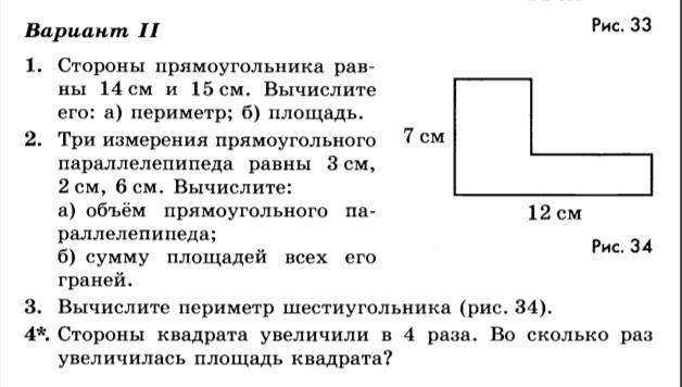 Вариант II Рис. 33 1. Стороны прямоугольника равны 14 см и 15 см. Вычислите его: а) периметр; б) площадь. 2. 2. Три измерения прямоугольного 7 см параллелепипеда равны 3 см, 2 см, 6 см. Вычислите: a) объём прямоугольного па- раллелепипеда; б) сумму площадей всех его граней. 12 см Рис. 34 3. Вычислите периметр шестиугольника (рис. 34). 4*. Стороны квадрата увеличили в 4 раза. Во сколько раз увеличилась площадь квадрата