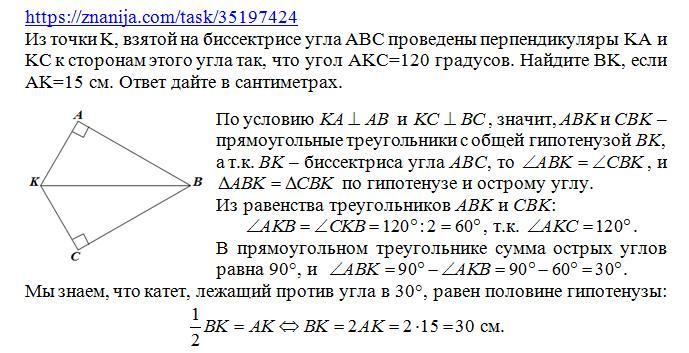 Из точки K, взятой на биссектрисе угла ABC проведены перпендикуляры KA и KC к сторонам этого угла так, что угол AKC=120 градусов. Найдите BK, если AK=15 см. Ответ дайте в сантиметрах.