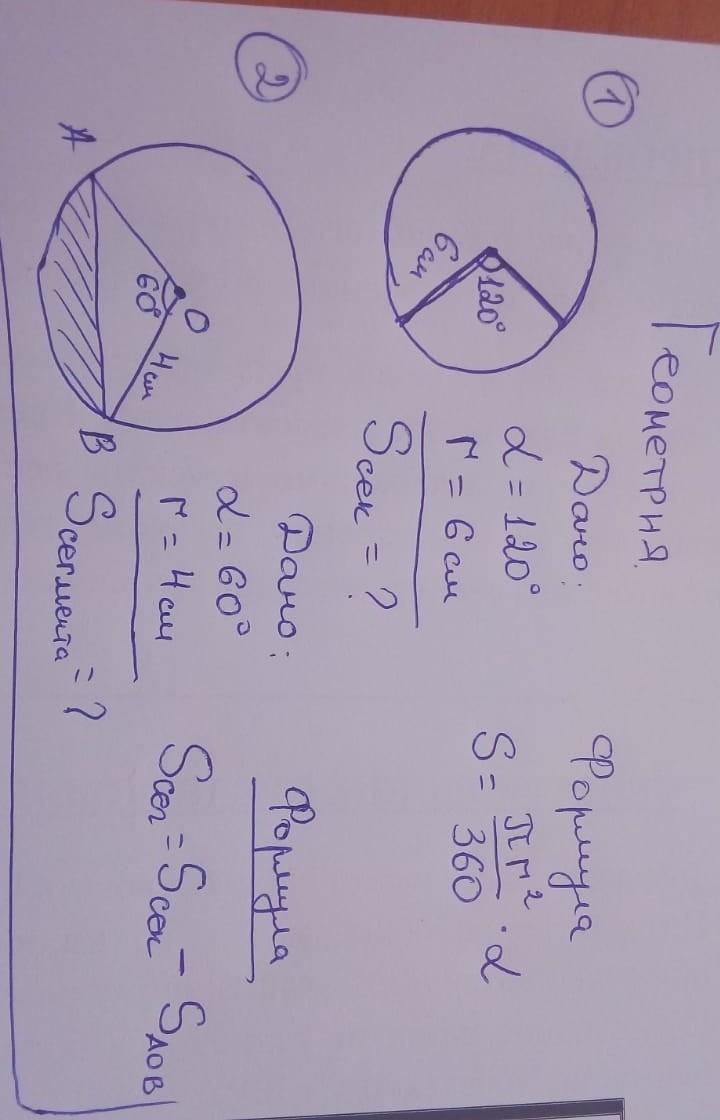 1)Sсек=(Пr²/360)×L=(3,14×6²/360)×120°=0,314×120°=37,68см²