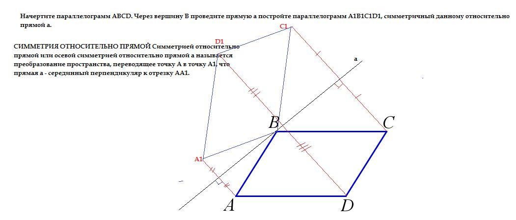 Начертите параллелограмм ABCD. Через вершину B проведите прямую a постройте параллелограмм A1B1C1D1, симметричный данному относительно прямой a.