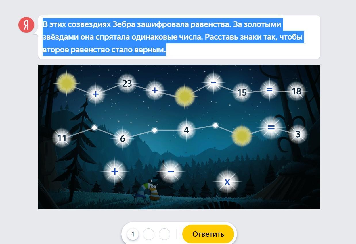 В этих созвездиях Зебра зашифровала равенства. За золотыми звёздами она спрятала одинаковые числа. Расставь знаки так, чтобы второе равенство стало верным.