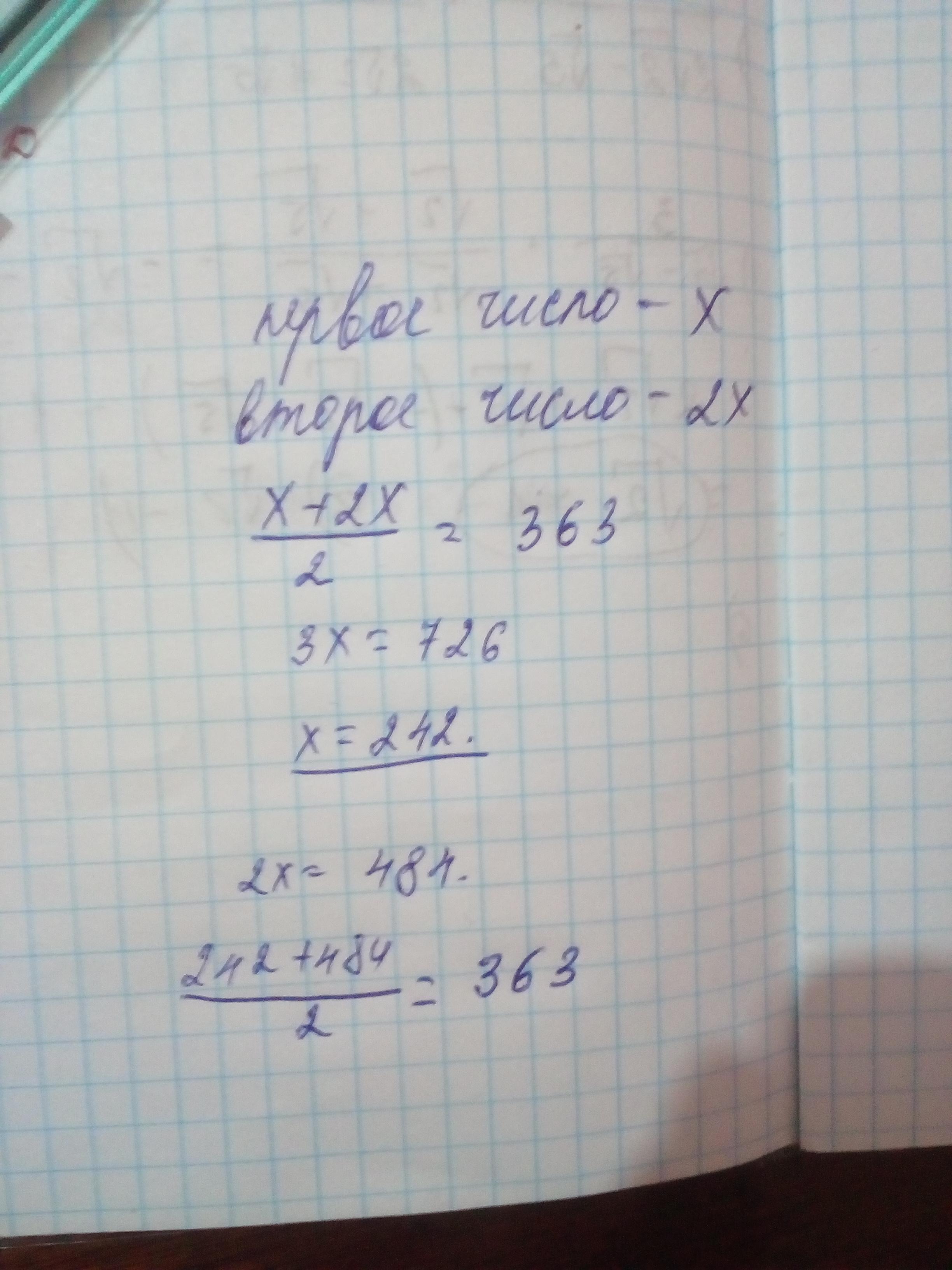 Одно число в 2 раза больше другого, среднее арифметическое этих двух чисел равно 363. Найти эти 2 числа. ПОМОГИТЕ ПЖ