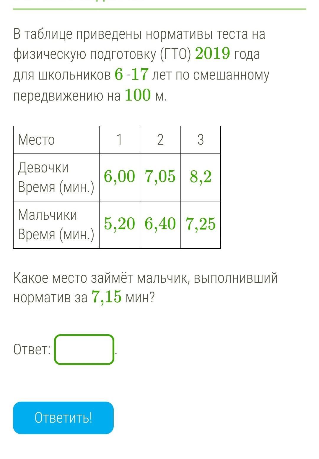 Начнём подставлять значение в таблицу. Этот мальчик не сможет занять 1 место, потому что для первого места нужно время 5,20 мин. Этот мальчик не займет 2 место, потому что для второго места нужно время 6,40 мин. Этот мальчик займет 3 место, потому что для третьего места нужно время 7,25 мин, а у мальчика время 7,15 мин . Его время всего на 10 секунд отклоняется от нормы, но это не значительно.